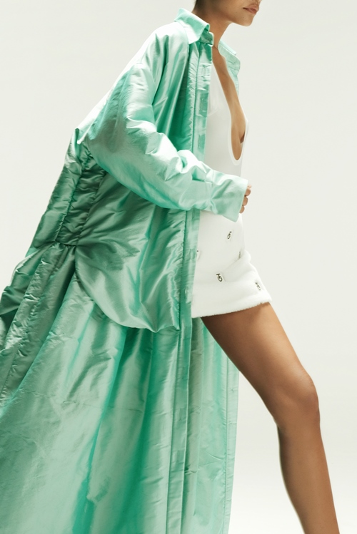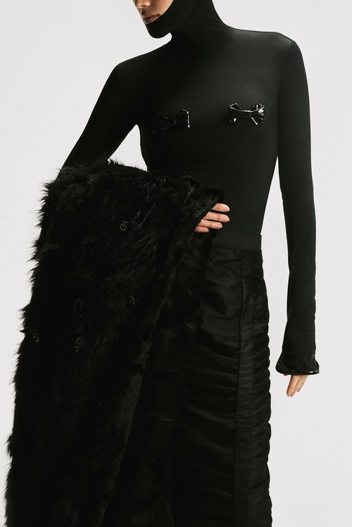Ví dụ điển hình là một chiếc áo thun đen ôm sát cơ thể, chiếc mũ trùm che khuất nửa sau đầu của người mẫu. Chiếc áo có điểm nhấn là phần nơ đính trước ngực, phối cùng chân váy taffeta cao cấp có hàng nút đính lộ tại mặt trước. Các thành tố đối nghịch được kết hợp nhằm nhấn mạnh tính vạn biến trong thời trang.