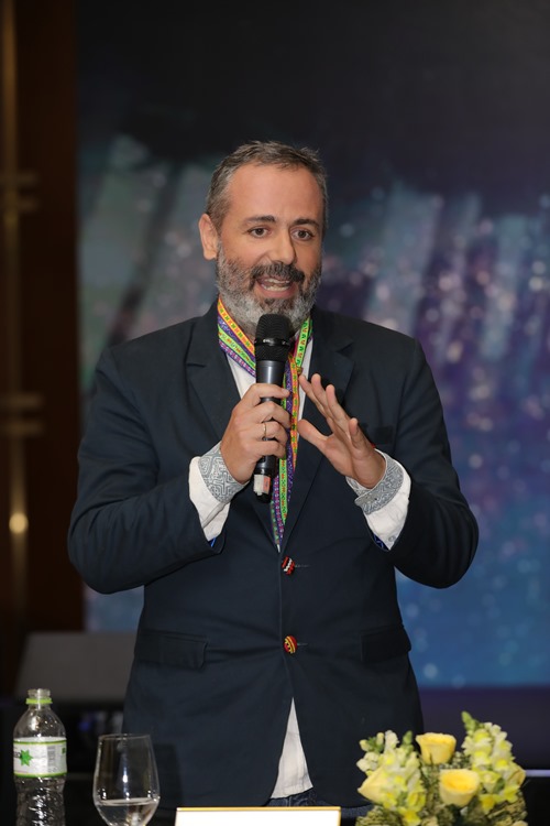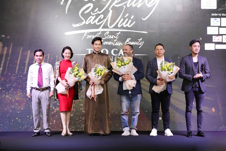 Ông Nguyễn Minh Quang - Phó Giám đốc Sở Văn hóa, Thể thao và Du lịch tỉnh Đắk Nông cùng ông Dương Quốc Hưng - Phó giám đốc Công ty Truyền thông Quảng Cáo Tấm và Cám, đơn vị thực hiện chương trình tặng hoa cho đạo diễn Nguyễn Hiếu Tâm và các nhà thiết kế Lý Quí Khánh, Valentine Vân Nguyễn và Diego Chula