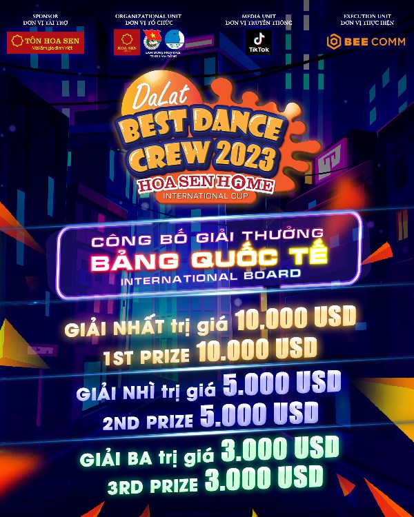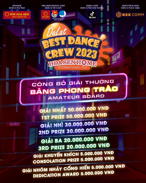 “Dalat Best Dance Crew 2023 – Hoa Sen Home International Cup” có 2 bảng thi tương ứng với 2 đêm thi và chủ đề riêng biệt, bao gồm: bảng Phong trào và bảng Quốc tế. Hiện chương trình vẫn đang diễn ra casting, thu hút hàng trăm nhóm nhạc trong và ngoài nước đăng ký tham gia.