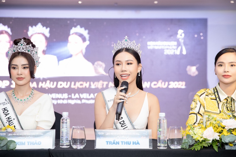 Trong khi đó, thí sinh Trần Thu Hà vỡ oà khi được gọi tên vào Top 3. Cô khẳng định bản thân sẽ làm được nhiều hơn để chứng minh việc mình giành Á hậu 2 Hoa hậu Du lịch Việt Nam Toàn cầu 2021 là hoàn toàn xứng đáng. Trong buổi gặp gỡ, khi được hỏi về bộ váy diện trong đêm chung kết bị nhận xét là đạo nhái một mỹ nhân Thái Lan, người đẹp cho hay: “Ban đầu, chiếc váy tôi lựa chọn để trình diễn trong đêm chung kết là một chiếc váy khác. Nhưng mẹ tôi khi theo dõi cuộc thi Miss Grand Thailand đã ấn tượng và thích bộ váy đó. Nên mẹ mong muốn tôi trình diễn bộ váy đó trong đêm chung kết".