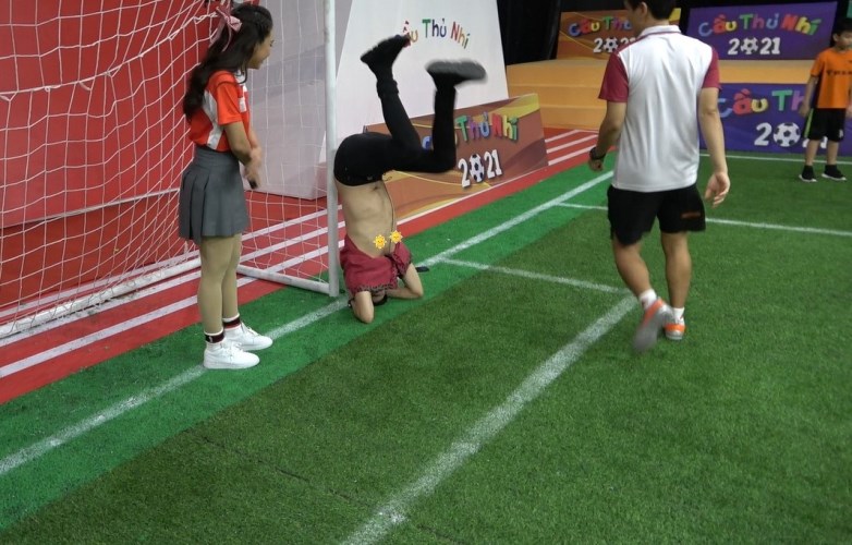 Không chỉ thế, đội trưởng đội “Cam” còn thử tạo dáng “trồng cây chuối” ở khung thành và bị ngã lộn nhào ra sau khiến ai cũng bật cười.
