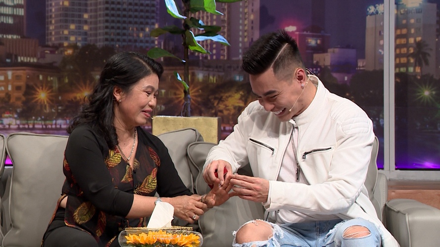Và con muốn nói với mẹ là con thương mẹ nhiều lắm. Ngày hôm nay con cũng có 1 món quà dành tặng cho mẹ, mượn chương trình này con chúc mẹ thật nhiều sức khỏe. Bây giờ là khoảng thời gian cha với mẹ có thể dưỡng già, không cần phải lo gì hết. Con hứa với mẹ con sẽ làm 1 người tốt...”.Dứt lời nam diễn viên xúc động lấy 1 chiếc nhẫn kim cương từ trong túi áo ra tặng mẹ.