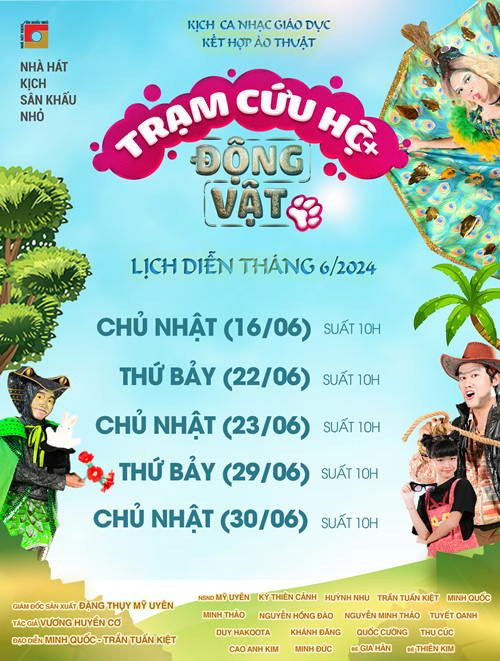 Vở kịch ca nhạc - ảo thuật “Trạm Cứu Hộ Động Vật” có sự tham gia của NSND Mỹ Uyên, Minh Quốc, Trần Tuấn Kiệt, Kỳ Thiên Cảnh, Nguyễn Hồng Đào, Nguyễn Minh Thảo, Tuyết Oanh, Quốc Cường, Khánh Đăng, Duy Hakoota, Thu Cúc, Cao Anh Kim, Gia Hân, bé Thiên Kim, Minh Đức…