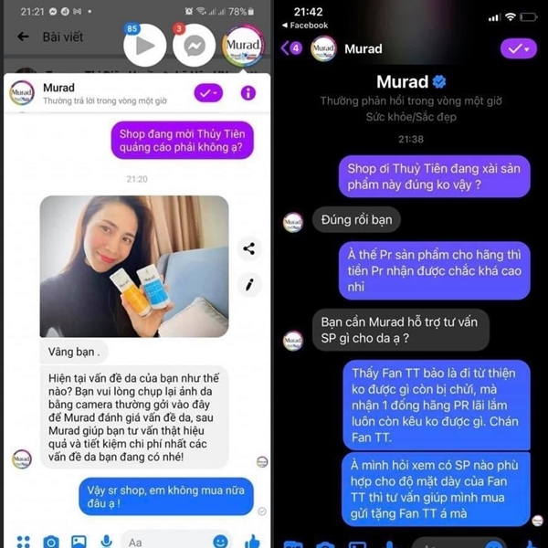 Theo đó, ngày 2/11/2020, ca sĩ Thủy Tiên đăng tải bài viết chia sẻ cảm nhận khi sử dụng sản phẩm Murad, nhận được sự quan tâm lớn từ dư luận. Đông đảo khách hàng đã có phản hồi tích cực về chất lượng, hiệu quả của các sản phẩm Murad khi từng sử dụng qua, cũng như bày tỏ sự ủng hộ Thủy Tiên để tiếp lửa tinh thần giúp nữ ca sĩ hoàn thành tốt công tác cứu trợ đồng bào miền Trung đang chịu thiệt hại nặng nề của lũ lụt.