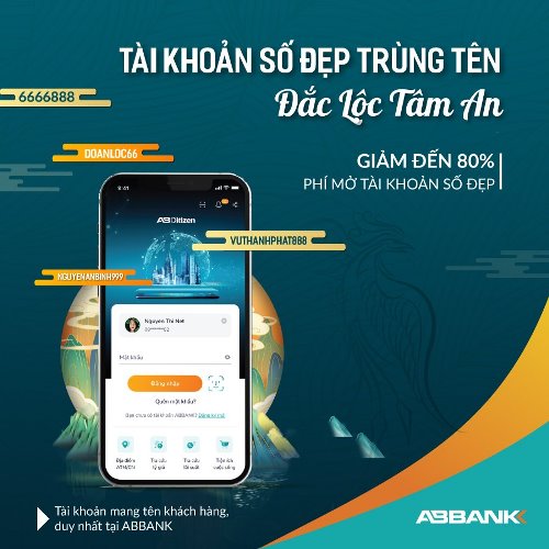 Song hành với tính năng mới này, ABBANK cũng đang áp dụng chương trình ưu đãi “Tài khoản số đẹp – Đắc Lộc Tâm An” với ưu đãi lên đến hơn 80% phí sở hữu tài khoản số đẹp cho khách hàng. Bên cạnh đó, tùy theo mỗi tài khoản số đẹp, khách hàng còn được gia tăng quyền lợi kèm như: miễn phí sử dụng AB Ditizen trọn đời, miễn phí phát hành và thường niên thẻ điện tử trọn đời, hưởng chính sách khách hàng ưu tiên… Chương trình ưu đãi sẽ kéo dài đến hết 18/09/2021.