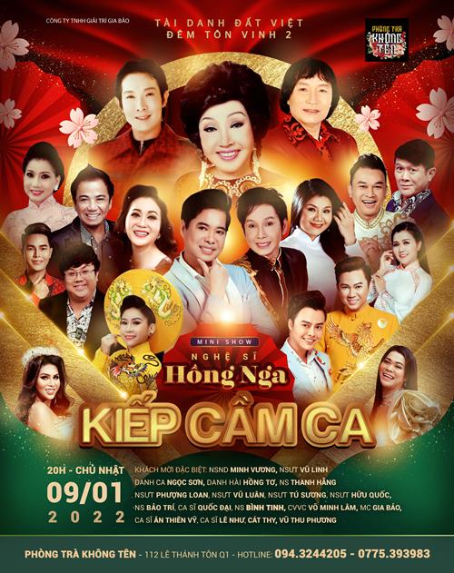 Đêm “Tài Danh Đất Việt - Đêm Tôn Vinh" với gương mặt tiếp nối là nghệ sĩ Hồng Nga sẽ chính thức được diễn ra vào 20g tối Chủ Nhật, ngày 09.01.2022 tại phòng trà Không Tên - 112 Lê Thánh Tôn, Q1.