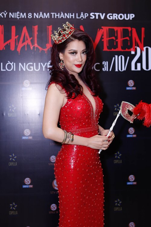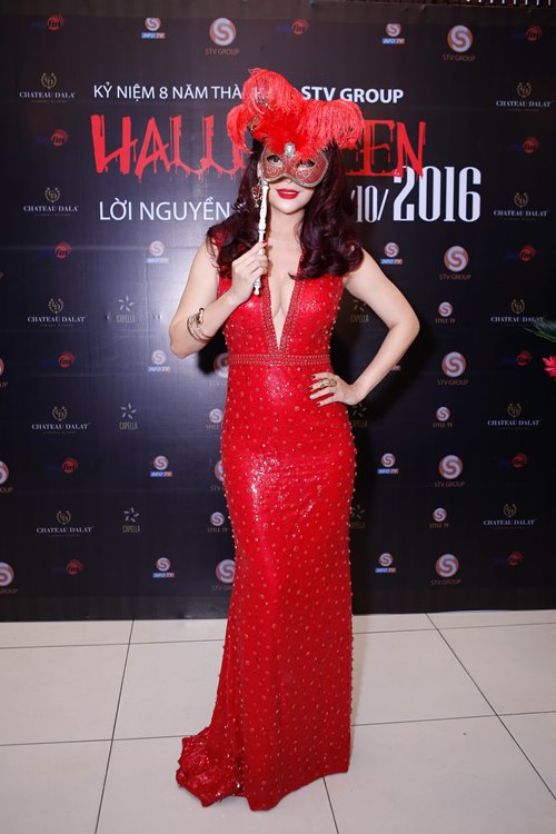 Trong chiếc đầm đỏ rực rỡ, Trương Ngọc Ánh cầm mặt nạ khoe vẻ đẹp gợi cảm và quyến rũ khi đến với lễ hội hóa trang.