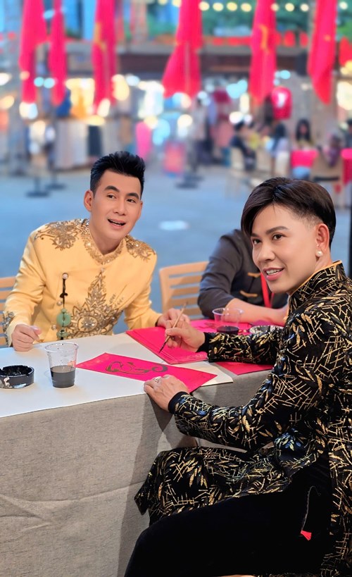 Ca sỹ Mai Tuấn dù đang có giờ lên lớp dạy học nhưng vẫn tranh thủ ghé qua thắp nén hương cho Tổ nghiệp. Năm nào giọng ca “Mưa bụi” luôn xin vài chữ thư pháp cầu mong may mắn.