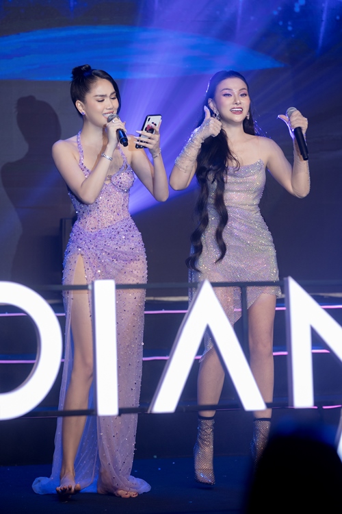 Ngọc Trinh đi chân đất song ca cùng Thu Thủy tại sự kiện “Lễ ra mắt sản phẩm Viên dưỡng da Diamond White Day & Night”.