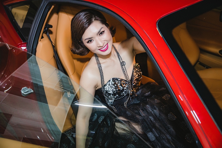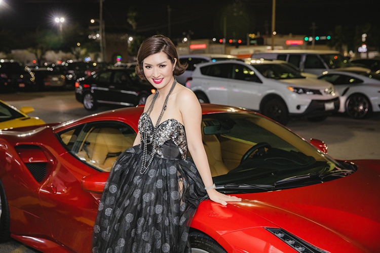 Đến tham dự chương trình, nữ ca sĩ xinh đẹp di chuyển trên chiếc siêu xe Ferrari trị giá hơn 500.000 USD, cô diện bộ váy voan đen quyến rũ với tà xẻ cao. Phụ kiện đeo cổ là vòng ngọc trai đen lên đến hàng chục ngàn USD.