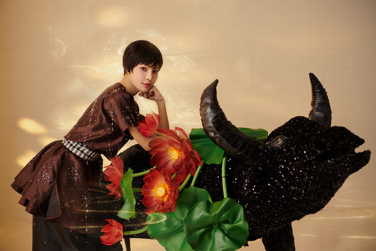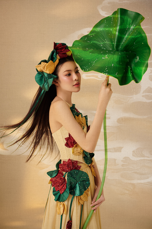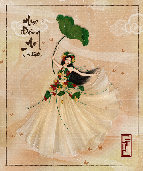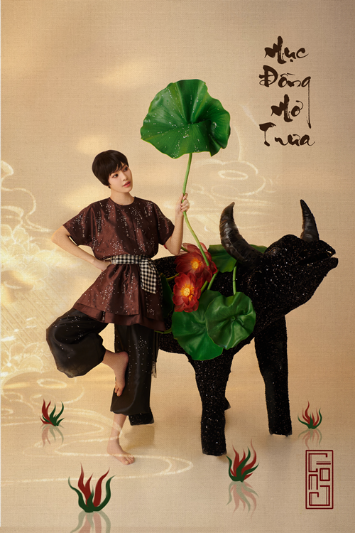 “Mục đồng mơ trưa” là thiết kế có sự biến đổi đầy ngoạn mục từ hình ảnh cậu bé chăn trâu với trang phục bà ba, khăn rằn cùng chú trâu được mô phỏng từ khung tre, lồng đèn trở thành một nàng tú nữ xinh đẹp, lộng lẫy trong chiếc váy yếm tone vàng. Từ câu chuyện “Chăn trâu thổi sáo” của dòng tranh Đông Hồ, Nguyễn Minh Công đã thổi vào đó cái hồn của thời trang đương đại pha lẫn truyền thống để hiện thực hóa giấc mơ của cậu bé chăn trâu năm nào. Dùng kỹ thuật đính 3D, Nguyễn Minh Công đã khéo léo thực hiện một tác phẩm “hai trong một” hài hòa, tinh tế và mang đậm dấu ấn thiết kế của NTK Công chúa.
