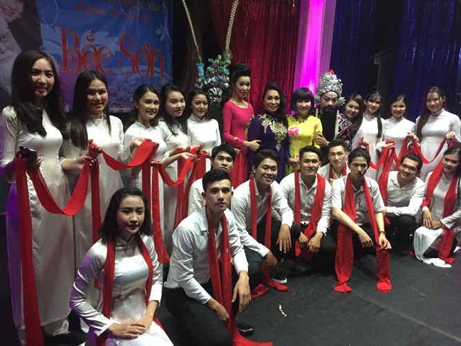 Các sinh viên khóa 21/2 Trường ĐH Sân khấu Điên ảnh TPHCM và các nghệ sĩ: NSND Bạch Tuyết, NSƯT Thanh Kim Huệ, NSƯT Trịnh Kim Chi và NS Minh Hòa trong đêm trao học bổng Bắc Sơn