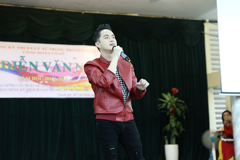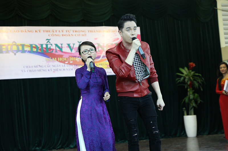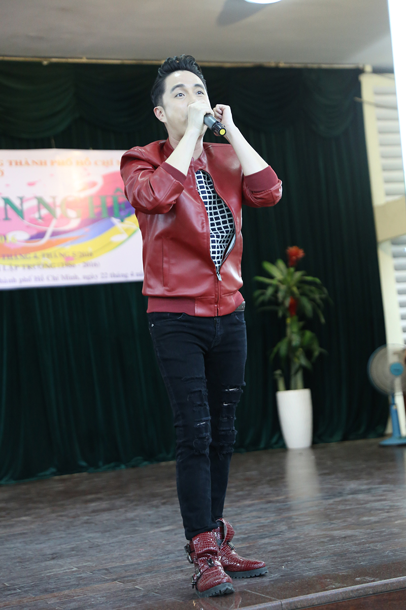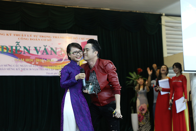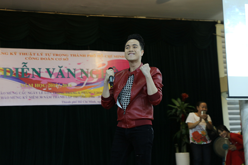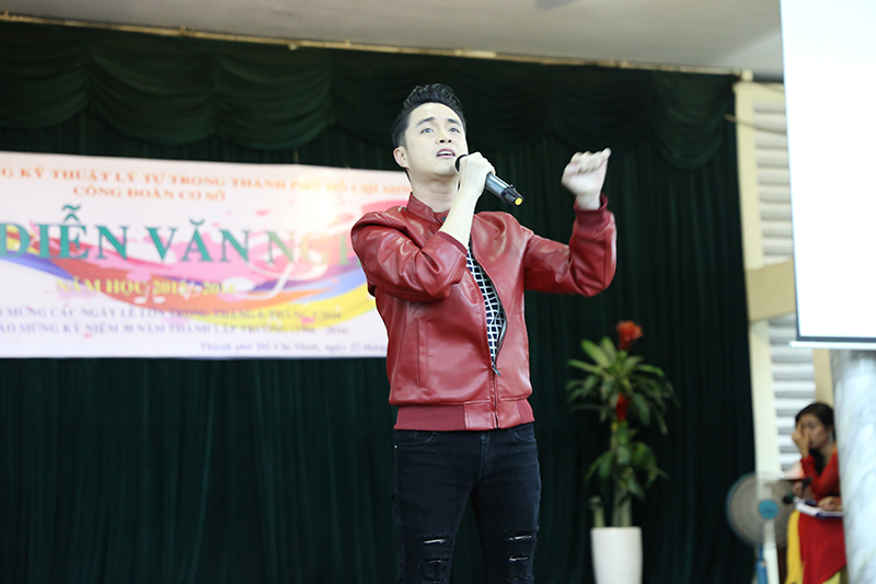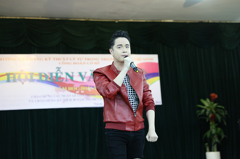 Đêm thi và trao giải hội thi văn nghệ với chủ đề “Mái trường thân yêu” vừa diễn ra tưng bừng vào tối 22-4 tại Trường Cao Đẳng Kỹ thuật Lý Tự Trọng TPHCM. Xuất hiện với vai trò khách mời, nam ca sĩ của “Vầng trăng khóc” đã khuấy động hội thi bằng những ca khúc hít sôi động của mình.