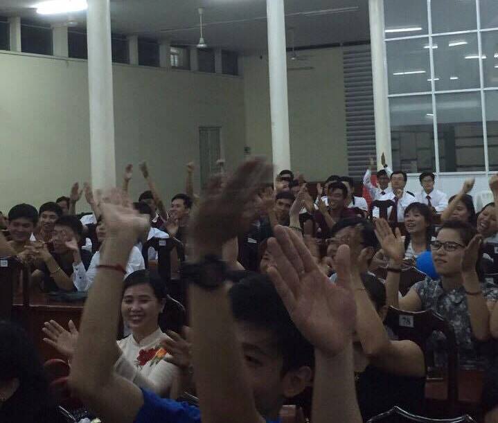 Các thầy cô giáo cũng như các sinh viên của trường đã cùng cổ động, cùng hát với ca sĩ Nhật Tinh Anh.