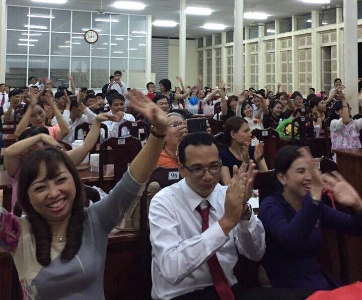 Các giáo viên và sinh viên của trường cổ động hết mình trong phần biểu diễn của Nhật Tinh Anh