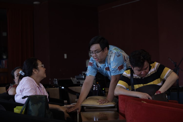 Bên lề không khí tập luyện, ông bầu Gia Bảo cũng có mặt để có thể theo dõi và kiểm soát thời lượng luyện tập. Nam nghệ sĩ cho biết việc thường xuyên quan sát, hỗ trợ các nghệ sĩ tiền bối là cách giúp việc tập tuồng theo đúng tiến độ và không làm phí sức các nghệ sĩ.