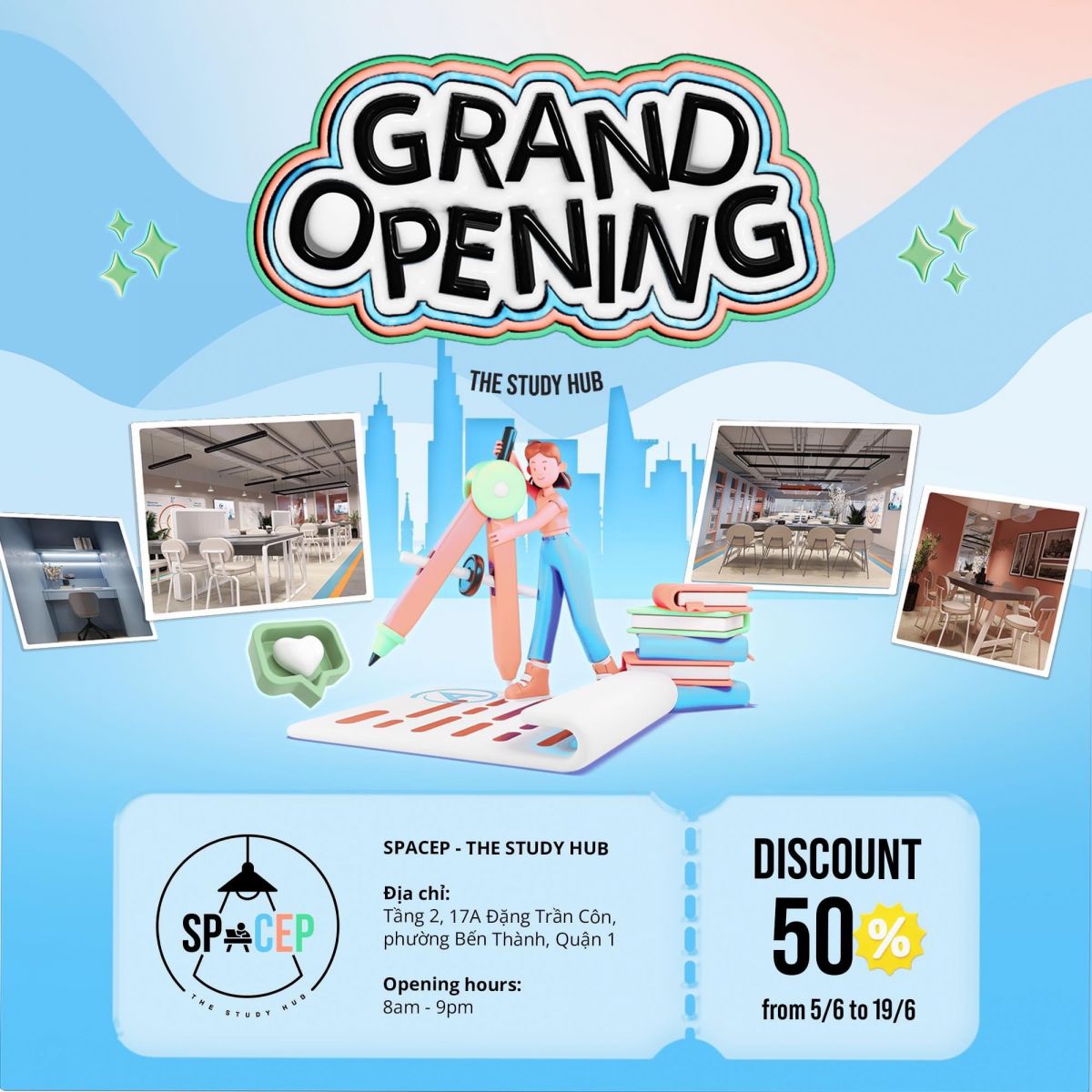 Không còn là bí mật nữa, chúng tớ sẽ bật mí căn cứ học tập mới toanh ngay tại trung tâm quận 1 với tên gọi SPACEP lấy cảm hứng từ nhu cầu cực kỳ lớn về một không gian học tập và làm việc hiệu quả và đầy đủ tiện nghi của học sinh và sinh viên.