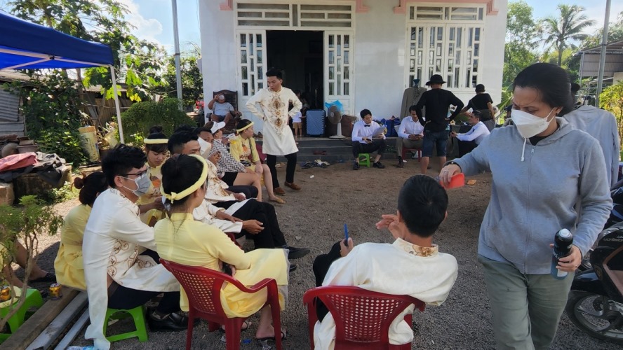 Tại hiện trường, một nhóm nam thanh nữ tú mặc đồ lễ cưới nhưng ngồi rất thứ tự, cô trang điểm thì liên tục chỉnh tóc, xịt keo rồi dặm nhẹ gương mặt cho từng người. Tất cả đều rất nghiêm túc làm theo yêu cầu của cô hoá trang. Tôi bắt chuyện hỏi thì mới biết: " Một mình em phải trang điểm cho hơn 10 diễn viên chính, sau đó chỉnh lại tất cả các các trẻ này. Từ sáng tới giờ em quên ăn, mà nếu ăn thì cũng không có thời gian để thưởng thức được. Phải tốc độ, phải khẩn trương để kịp tiến độ anh à. Cả đoàn phim ai cũng thế, làm nghề mà!".