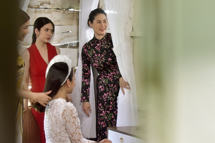 Quả thật, khi đội hình bên nhà trai ngay hàng thẳng lối trao mâm lễ, tôi thấy ai cũng tươi tắn, xinh xắn trong từng khung hình, nhưng để được "một bức tranh cưới" đẹp như... phim, đâu phải khán giả nào cũng biết, những người làm nghề đã phải thức từ 5 giờ sáng và liên tục "căng thẳng" làm việc thì mới mong đáp ứng được yêu cầu của đạo diễn Thái Trình.