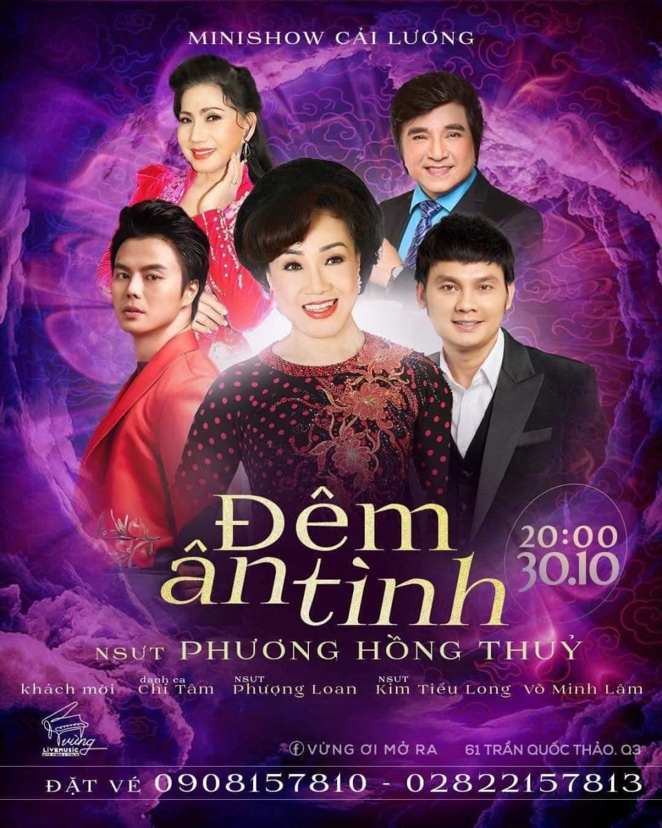 Vào ngày 30/10/2022 tới đây, NSƯT Phương Hồng Thủy sẽ tổ chức Minishow chủ đề “Đêm ân tình” tại Phòng trà Vừng Ơi Mở Ra , số 61 - Trần Quốc Thảo - Q 3 ). Chương trình có sự tham gia của các khách mời: Danh ca Chí Tâm, NSƯT Phượng Loan - NSƯT Kim Tiểu Long - CVVC Võ Minh Lâm.