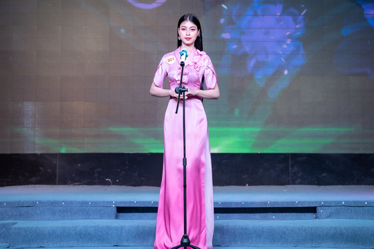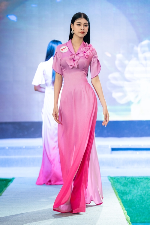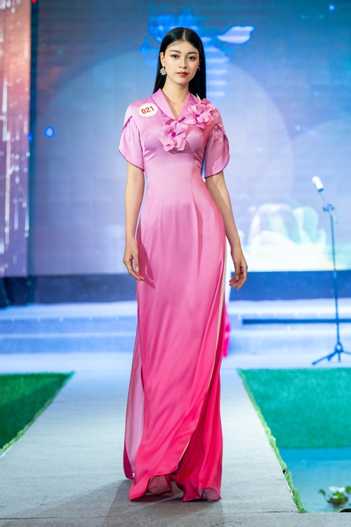 Với sự tươi trẻ, nữ tính và mềm mại cùng bộ áo dài hồng của Nhà thiết kế Việt Hùng