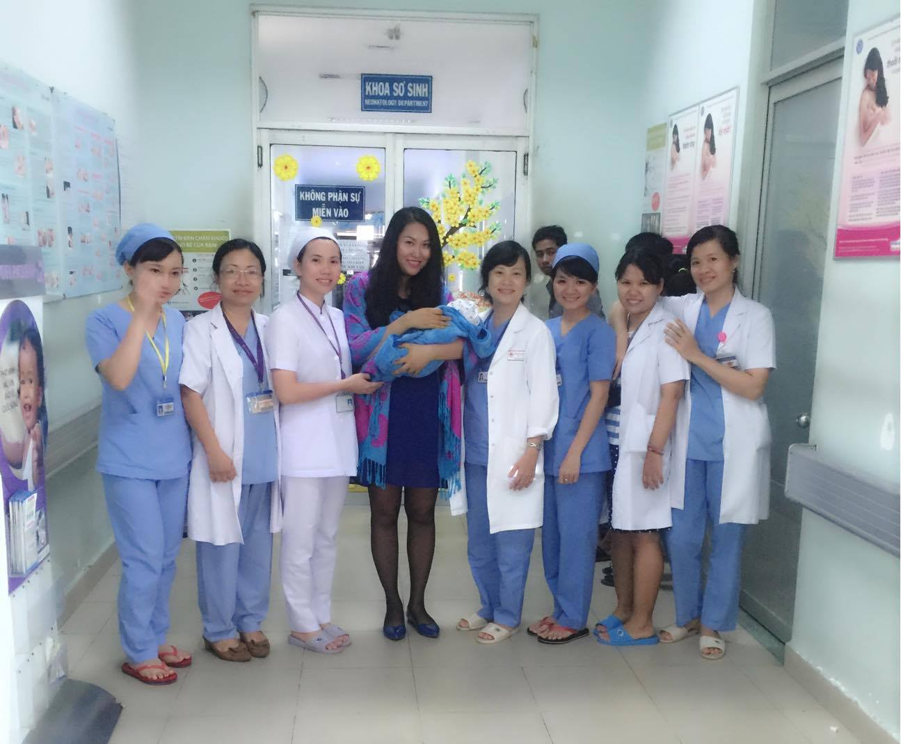 Phi Thanh Vân và các bác sĩ, hộ lý tại bệnh viện lúc sinh em bé xong