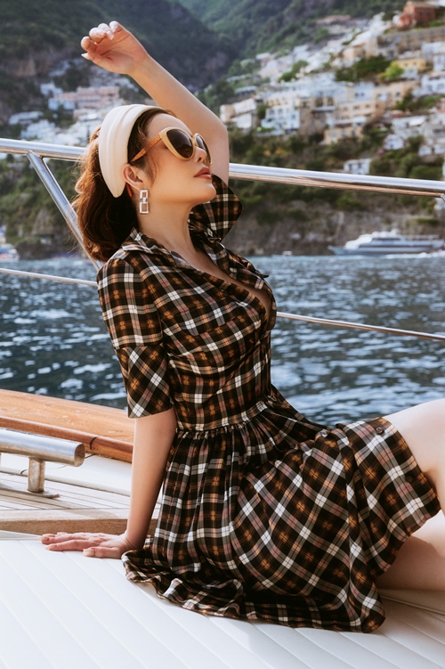 Trên du thuyền sang chảnh, Lý Nhã Kỳ khoe chân thon dài, làn da trắng mịn trong loạt trang phục xẻ cao khoe được vòng 1 đầy đặn. Kính mát chắc chắn là món đồ không thể thiếu của Lý Nhã Kỳ trong những set đồ trên du thuyền. Không đơn thuần chỉ bảo vệ mắt trước nắng hè chói chang mà còn thể hiện phong cách và tăng thêm tính thẩm mỹ khi phối đồ. Các set đồ bao gồm: Bộ 1: Áo sơ mi tone xanh trời kết hợp với quần ống suông, mang lại sự thanh lịch và nổi bật, chất liệu linen hợp với các chuyến du lịch nhẹ nhàng, phối cùng áo sọc khoác vai hơi hướng thủy thủ, đây cũng là phong cách đặc trưng của Châu Âu. Bộ 2: áo tắm phong cách cổ điển, kết hợp cùng những đường cut out tôn dáng. Bộ 3: tại một ngôi làng xinh đẹp thì ko thể thiếu những bộ cánh mang phong cách vintage, và chiếc đầm caro đến từ thương hiệu Dsquared2 giúp Lý Nhã Kỳ thay đổi sang phong cách nữ tính, quyến rũ nhưng vẫn giữ được vẻ sang trọng. Các thiết kế mang đậm dư vị của quý cô mùa hè, vừa lịch sự lại đủ phóng khoáng cho những chuyến nghỉ dưỡng.