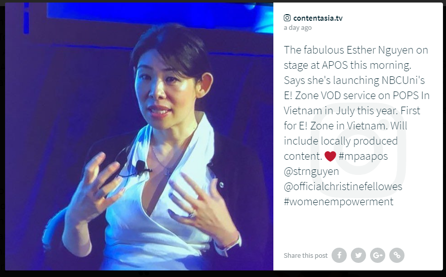 Trong phần tham gia thảo luận của mình tại APOS 2018, bà Esther Nguyễn đã trình bày về việc sẽ phát hành chính thức trang thông tin điện tử E!Zone đầu tiên tại thị trường Việt Nam thông qua sự hợp tác giữa POPS Worldwide và NCBUniversal vào tháng 7 tới đây.