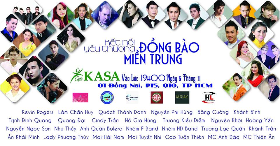 Chương trình “Kết nối yêu thương vì đồng bào Miền Trung” diễn ra vào lúc 19g thứ bảy 5/11/2016, tại Cà phê Kasa (1 Đồng Nai, Q.10, TP.HCM) với sự tham gia của các ca sĩ quen thuộc như Lâm Chấn Huy, Nguyễn Phi Hùng, Quách Thành Danh, Bằng Cường, Khánh Bình, Cindy Trần, Quang Đại (X-Factor), Nguyễn Ngọc Sơn, Trương Kiều Diễm, Lady Phương Thùy, Trịnh Đình Quang, Hồ Gia Hùng, Nguên Khôi, Hoàng Yến, Như Thủy, Anh Quân Bolero, Trương Lạc Quân, Khánh Trần, Ân Khải Minh, Mai Hải Nam, Mai Tuyết Nhi, Cao Tuấn Thiên, Nhóm F Band, HD Band, MC Anh Đào - Thiên Ân. Đặc biệt còn có sự góp mặt của ca sĩ người Mỹ Kevin Rogers hát nhạc Việt rất hay.