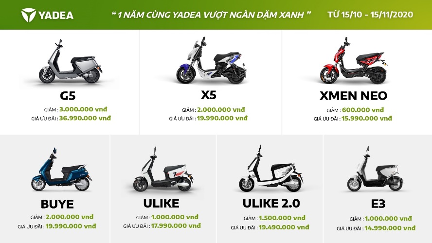 Các mẫu xe khác của YADEA cũng được áp dụng giá ưu đãi với mức giảm từ 1-2 triệu đồng trong thời gian từ 15/10 đến 15/11/2020.