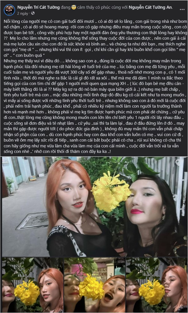 Cát Tường được biết đến là bà mẹ đơn thân và Nauy – cô con gái duy nhất là tài sản quý báu, động lực để nữ diễn viên nỗ lực, phấn đấu trong cuộc sống. Hơn 6 năm con gái du học nước ngoài, hai mẹ con sống cách xa nhau, Cát Tường luôn trăn trở vì hành trình trưởng thành quan trọng nhất của con mà nữ diễn viên lại không đồng hành được. Tuy vậy, cô may mắn khi con gái mạnh mẽ, tự lập và lại là chỗ dựa tinh thần ngược lại cho mình. 21 tuổi, Nauy trở thành một cô gái xinh đẹp, thông minh và nhạy bén. Cát Tường vừa đảm nhận cả 3 vai trò khi vừa làm mẹ, là cha và đặc biệt là người bạn thân thiết nhất của con gái. Cũng vì thế mà vừa mới đây, trên trang cá nhân của nữ nghệ sĩ có dòng chia sẻ đầy tâm sự về cô con gái 21 tuổi khiến nhiều người xúc động. Cát Tường cho biết, cô đã rất lo lắng, mất ngủ và trăn trở khi một ngày con gái nhắn tin về nói về nỗi buồn, cô đơn, trống trải và thật sự đang rất cần chỗ dựa. Cô hiểu, con gái đang buồn trong chuyện tình cảm và rất cần chỗ dựa tinh thần để vượt qua những cơn sóng lớn đầu đời.