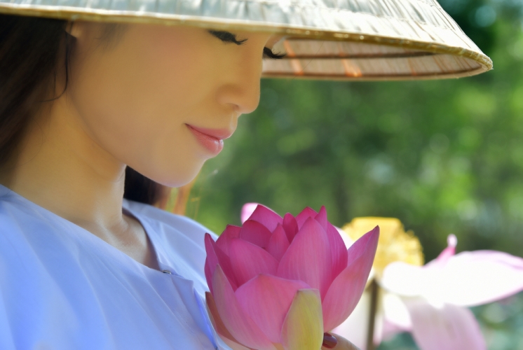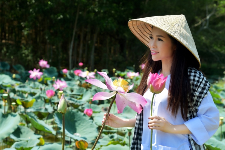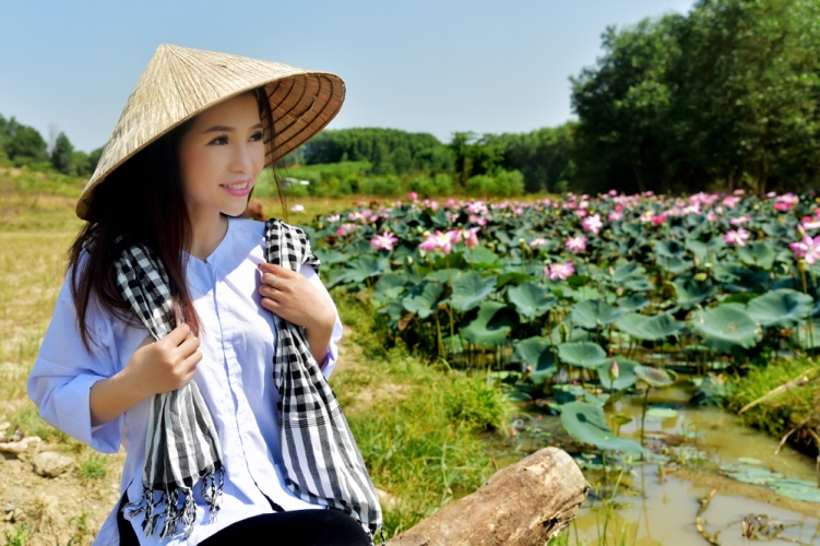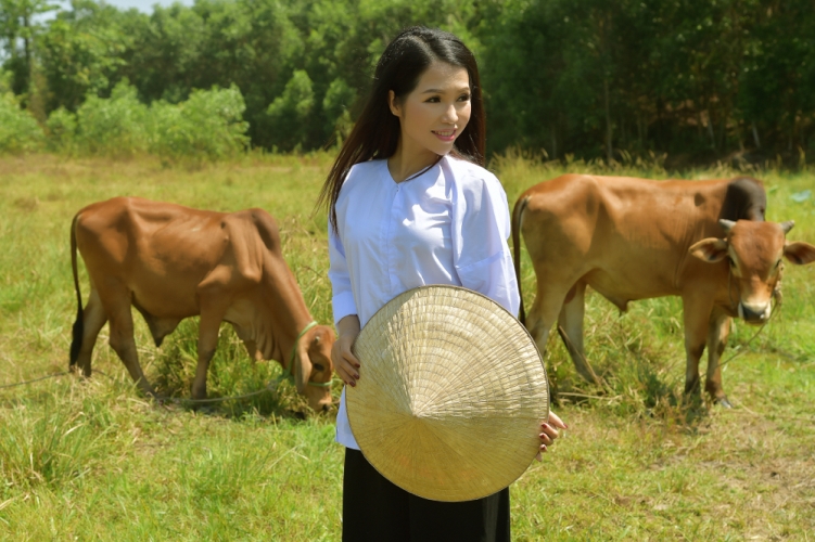 Với chiếc áo bà ba trắng, đội chiếc nó lá truyền thống Thanh dễ dàng hoá thân với cách tạo hình cô thôn nữ bên hồ sen tuyệt đẹp, phía sau là những chú bò đang thư thả gặm những ngọn cỏ xanh tươi.