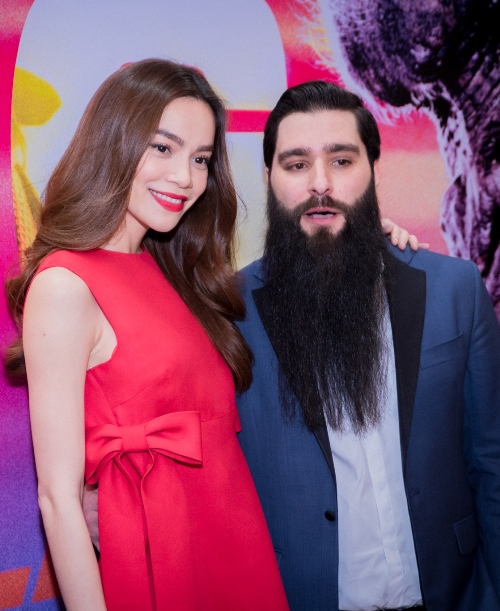 Kathy Uyên giới thiệu đạo diễn Jordan với từng vị khách đến buổi tiệc và luôn bên cạnh đảm nhiệm vai trò thông dịch viên giúp Jordan trong những buổi phỏng vấn.