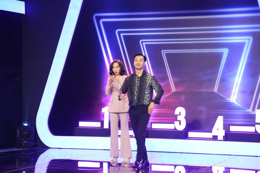 Diệu Nhi cầm mic, khúm núm đi phía sau Thành Trung khiến cả trường quay bật cười