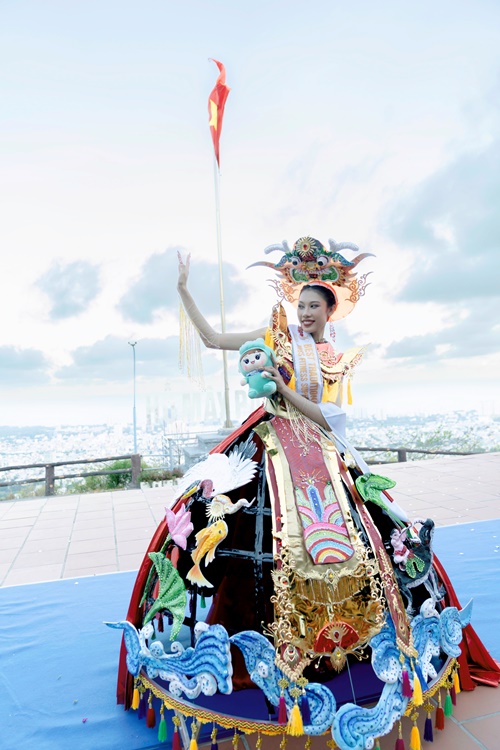 Tuyết Mai đã có phần trình diễn ấn tượng với bộ trang phục kỳ công của NTK Khắc Hoàng mang tên “Te Tò He”. Bộ trang phục dân tộc rực rỡ sắc màu cùng các họa tiết công phu tinh xảo này được lấy ý tưởng từ tò he, một loại đồ chơi dân gian truyền thống gắn liền với tuổi thơ của nhiều thế hệ người Việt Nam. Tò he được làm từ bột gạo nếp, được nhuộm màu sắc rực rỡ và nặn thành nhiều hình thù ngộ nghĩnh, đáng yêu. Tò he không chỉ là một món đồ chơi đơn thuần mà còn mang giá trị văn hóa sâu sắc gắn liền với tuổi thơ của biết bao thế hệ. “Te tò he” với chất liệu truyền thống giản dị cùng nhiều màu sắc độc đáo đã đem đến cho người xem góc nhìn phong phú về văn hoá Việt. Ngoài ra, nó còn tượng trưng cho sự may mắn, sung túc và hạnh phúc.