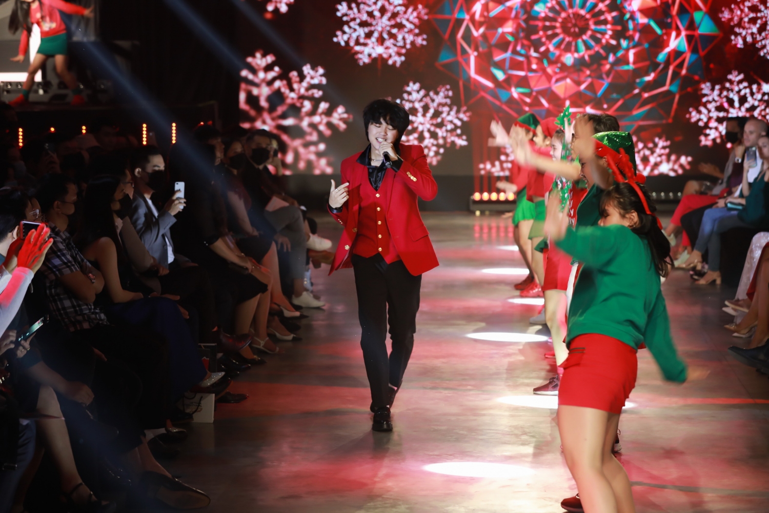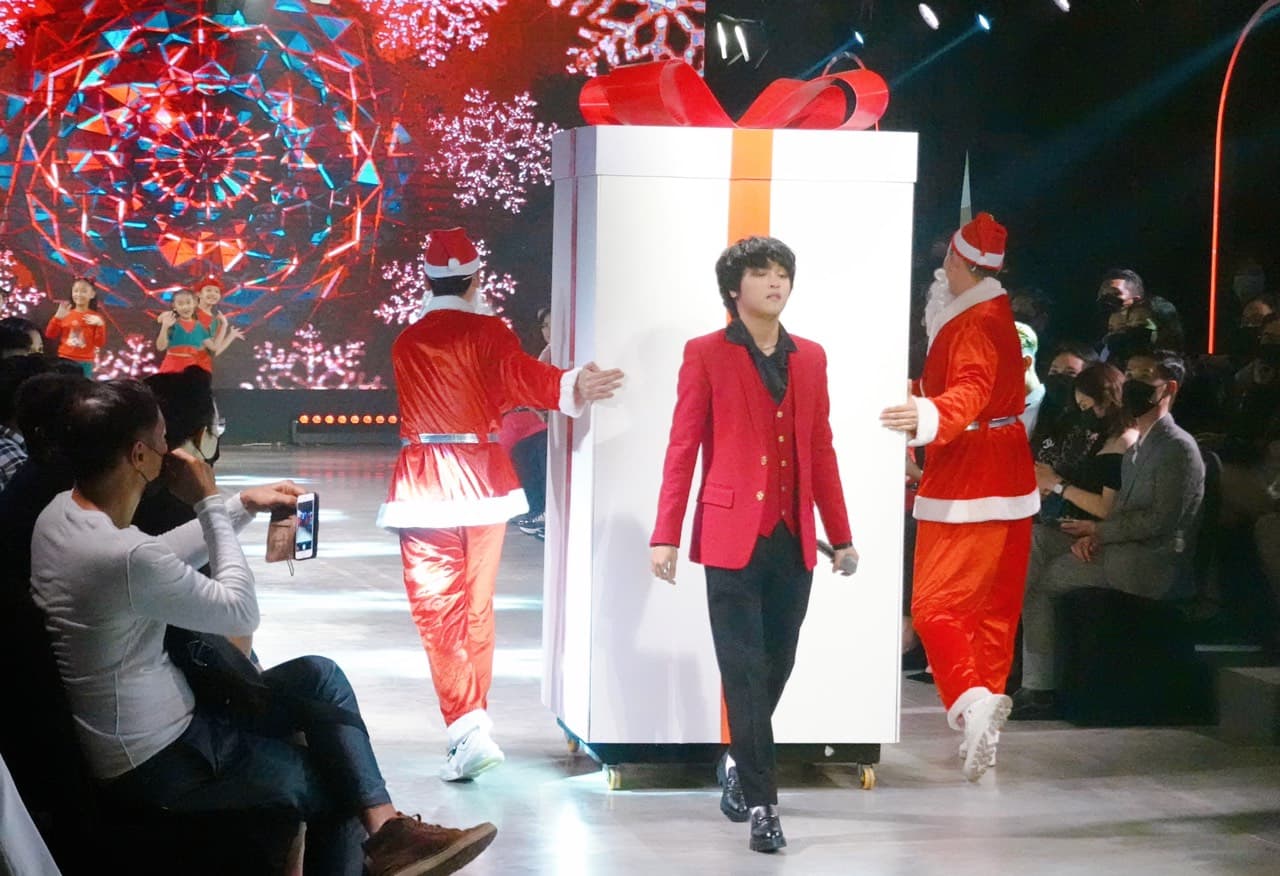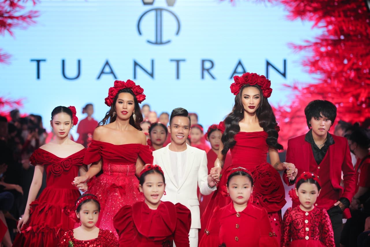 Ngoài ra, đạo diễn catwalk Hưng Phúc còn cho Thiên Khôi kết hợp với siêu mẫu Hà Anh, Hoàng Yến cùng các mẫu nhí trình diễn bộ sưu tập thời trang rực rỡ sắc màu Noel của NTK Tuấn Trần.