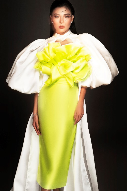 Khoác lên mình những bộ trang phục khác nhau của 3 nhà thiết kế Lê Thanh Hoà, Lê Ngọc Lâm, Nguyễn Đạt, Thúy Diễm vẫn kết nối được 3 phong cách ấy với sự tự tin, quyến rũ và có chút gì đó đặc biệt bí hiểm của riêng mình.