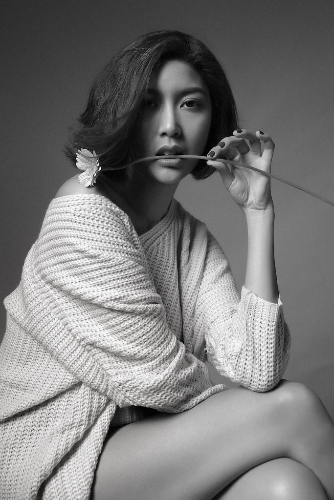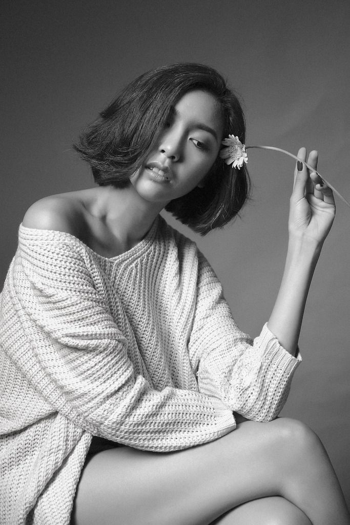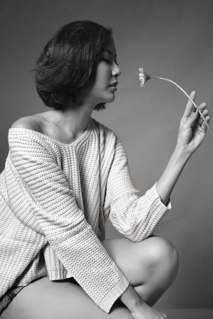 Ở góc độ khác, Thúy Vân lột tả được nét nữ tính trong trang phục len và những biểu cảm tự nhiên, đùa nghịch cùng hoa. Chính những biểu cảm tự nhiên trên tông màu đen trắng cùng mái tóc ngắn đã giúp Thúy Vân có một màn make over rất ấn tượng.