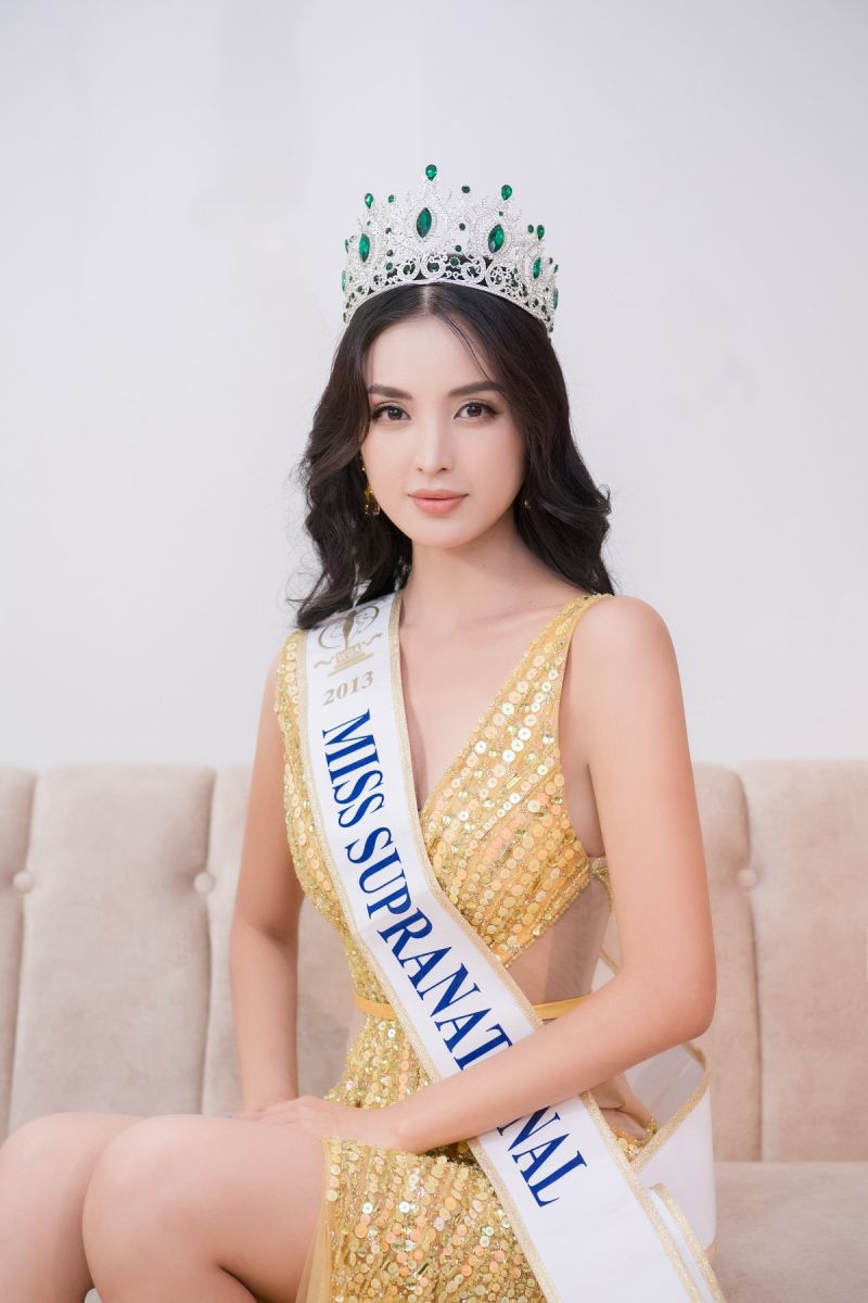 Bên cạnh đó, Miss Superanational 2013 còn khoe sắc với chiếc váy màu vàng ánh kim xẻ có điểm nhấn là phần xẻ ngực táo bạo. Ở phong cách này, mỹ nhân đẹp nhất Philippines càng thêm cuốn hút và quyền lực khi kết hợp với chiếc vương miện.