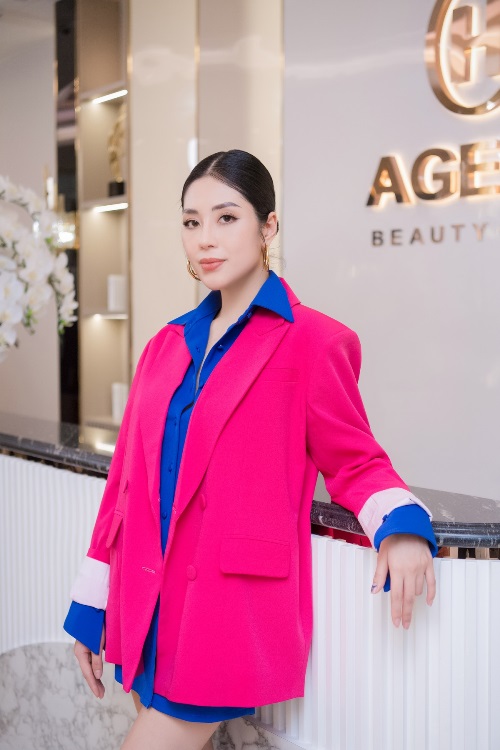Trong khi đó, Hoa hậu Tô Diệp Hà lại chọn cho mình một phong cách cá tính hơn với chiếc đầm sơ mi màu xanh và áo vest màu hồng neon khoác ngoài. Cô cũng thể hiện sự táo bạo của bản thân khi chọn một đôi cao gót cùng tông với áo vest. Có thể nói, tổng thể này không chỉ giúp cô khoe được làn da trắng mà còn khiến người đẹp trở nên khác biệt hơn.