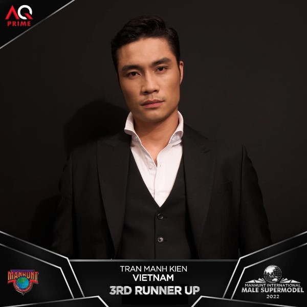 Đại diện Việt Nam- Trần Mạnh Kiên đã xuất sắc đăng quang ngôi vị Á vương 3 trong đêm chung kết Manhunt International 2022 vừa diễn ra vào hồi 18h tối nay theo giờ địa phương tại Manila, Phillipines. Nam vương của cuộc thi thuộc về đại diện người AUSTRALIA. Á vương 1 thuộc về đại diện Philippines, Á vương 2 thuộc về đại diện đến từ Mỹ, Á vương 4 thuộc về đại diện người Hà Lan.