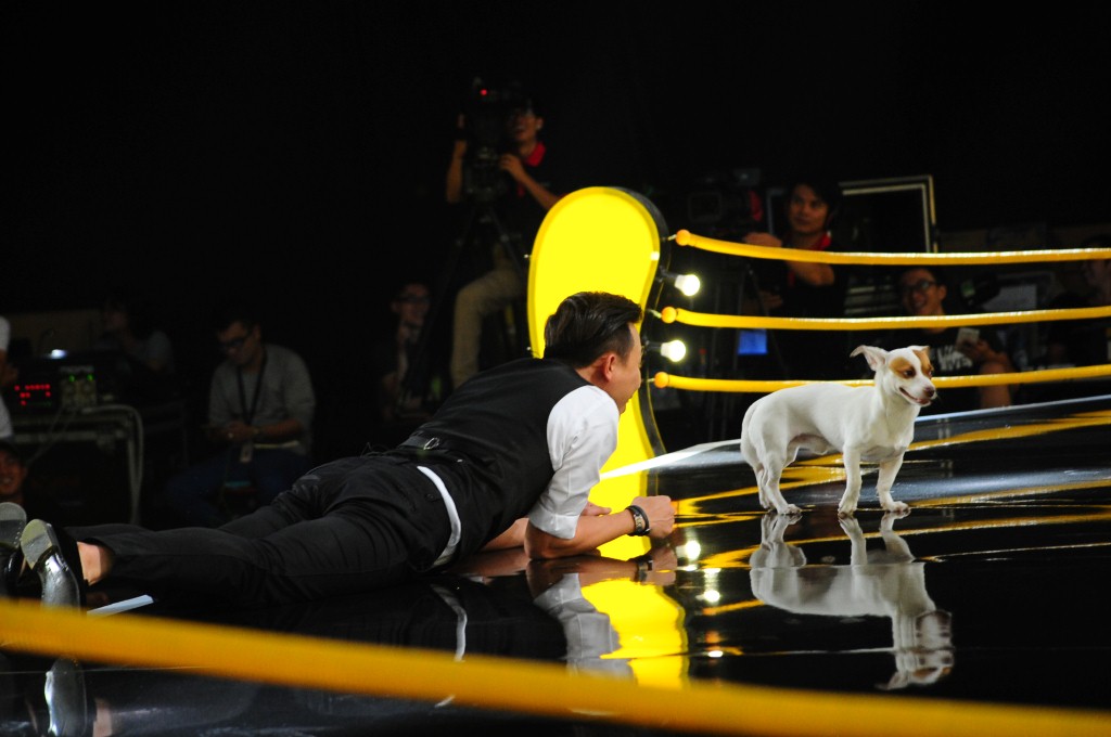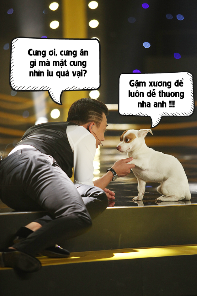 HLV Trấn Thành hoàn toàn bị “hớp hồn” trước vẻ dễ thương và gương mặt đáng yêu của chú chó này, đến nổi phải...nằm dài ra sân khấu để chơi đùa cùng chú