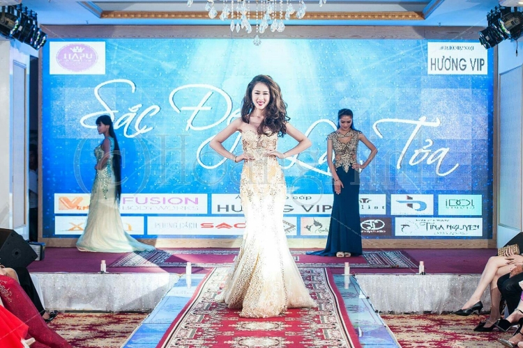Các thi sinh lần lượt trình diễn 2 BST áo dài Hương Vip và áo dạ hội tự chọn đầy cuốn hút trong sự cổ vũ nhiệt tình của hơn 500 khách mời đến tham dự.
