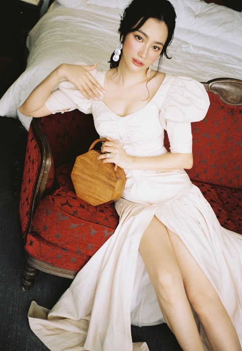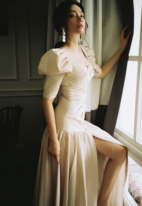 Người đẹp diện thiết kế váy nữ tính, khoe nhan sắc trẻ trung trước ống kính. Ở một số khoảnh khắc, đại diện Việt Nam tại Hoa hậu Trái đất 2007 còn có cách tạo dáng nóng bỏng, khoe hình thể quyến rũ nhờ tích cực tập luyện, ăn uống khoa học.