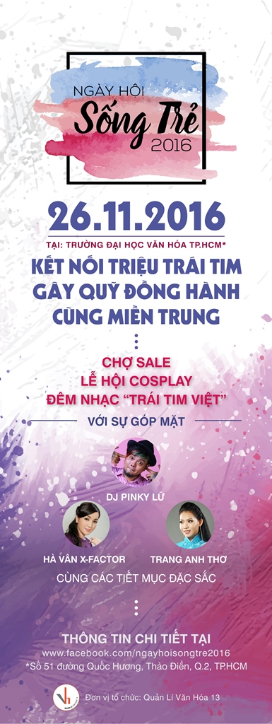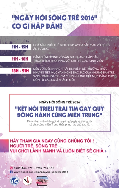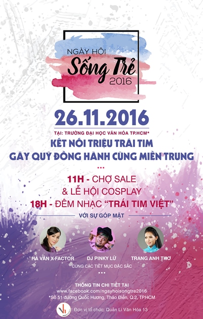 Sự kiện diễn ra từ 11h00 đến 21h00 ngày 26/11/2016 tại sân Trường ĐH Văn Hóa TP.HCM (Số 51 đường Quốc Hương, Phường Thảo Điền, Quận 2). “Ngày hội sống trẻ” là một sự kiện hoành tráng, náo nhiệt lần đầu tiên được tổ chức với các hoạt động mang tính giải trí, mới lạ, hấp dẫn như Chợ Sale, giao lưu với các nghệ sĩ Cosplay. Đặc biệt Điểm nhấn của chương trình là đêm biểu diễn nghệ thuật với chủ đề “Trái tim Việt” đậm chất nhân văn nhằm gây quỹ ủng hộ đồng bào Miền Trung.