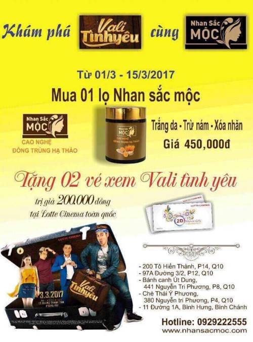 Ngoài ra, một mini game đồng hành của nhãn hàng cũng sẽ khởi động chung (từ ngày 3/3 đến 18/3) là khi khán giả mua vé xem phim Vali tình yêu với các bước đơn giản cũng sẽ trúng thưởng: Chụp hình vé chiếu phim Vali tình yêu. Hastag #tên diễn viên yêu thích trong phim: #huykhanh, #vyoanh, #bachcongkhanh, #dongduong, #huynhlamanh, #chauminhchi, #tuandung, #hoangmap, #kieulinh …đính kèm quan trọng nhất là #NHANSACMOC - để nhận giải. Cụ thể: #huykhanh #NHANSACMOC Giải thưởng: 3 giải cao nhất với mỗi giải là một sản phẩm Nhan sắc mộc + nón có in hình diễn viên mà bạn đã bình chọn. Công dụng: bồi bổ sức khoẻ - dưỡng nhan. Giúp làn da căng mịn, làm mờ vết nám, giảm dần nếp nhăn và làn da trắng sáng khi kết hợp trong uống ngoài thoa. Địa chỉ Showroom: 200, Đường Tô Hiến Thành, Quận 10, TP. HCM.