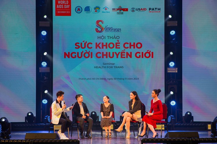 Anh Nguyễn Anh Phong - Phó Chủ tịch Hội Phòng chống HIV/AIDS TP.HCM cùng NS Kim Xuân, Mỹ Uyên, NTK Sĩ Hoàng tại sự kiện