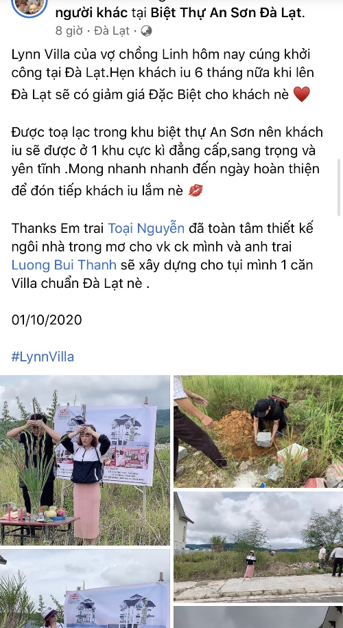 Trên trang cá nhân, diễn viên Kiều Linh chia sẻ vợ chồng cô vừa cúng khởi công một villa mang tên Lyn villa tại Đà Lạt.