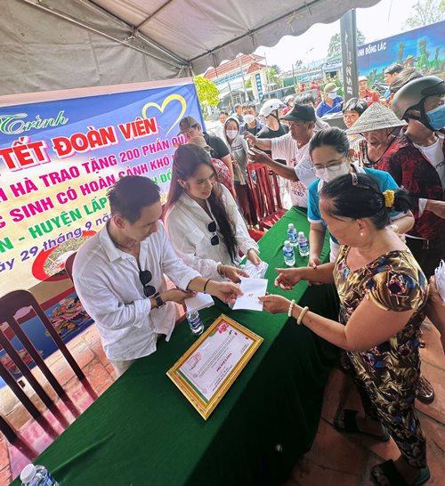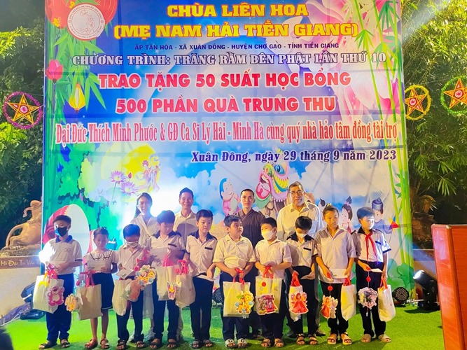 Cũng trong dịp này, vợ chồng Lý Hải-Minh Hà còn đến Chùa Liên Hoa để cùng Đại Đức Thích Minh Phước trao 50 suất học bổng (500.000/suất) và 500 phần quà Trung Thu cho bà con ở Ấp Tân Hòa, Xã Xuân Đông, Huyện Chợ Gạo, Tỉnh Tiền Giang.