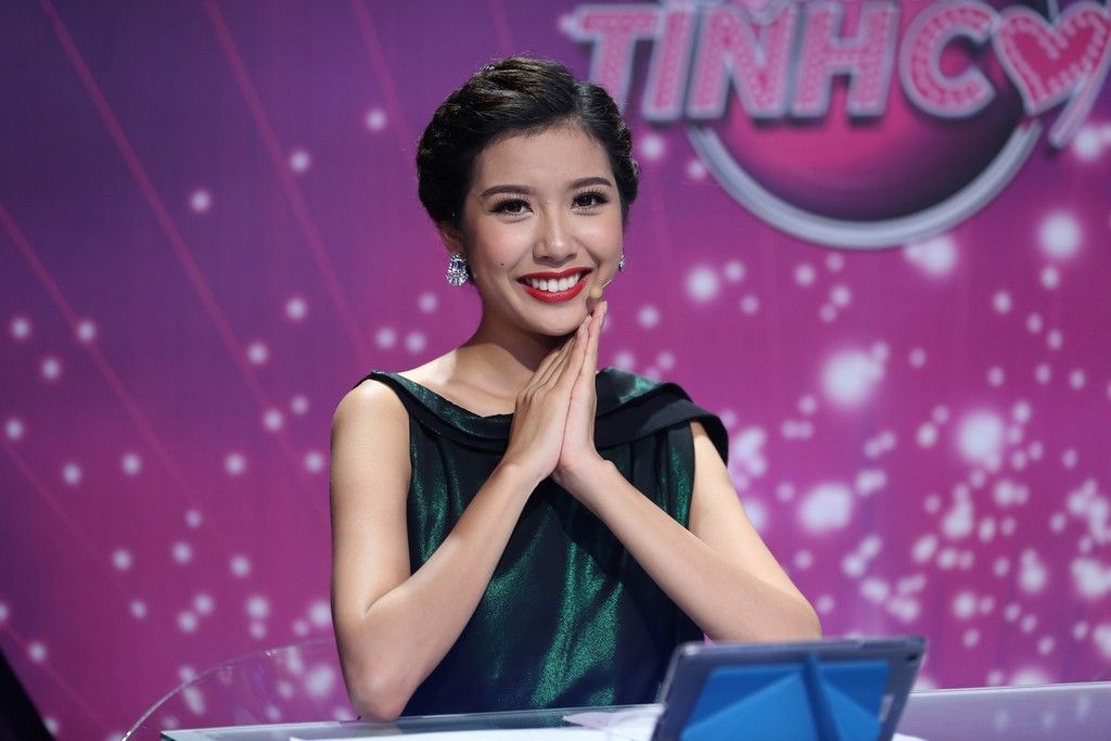Thúy Vân nhìn chững chạc hơn so với tuổi thật khi diện đầm satin bóng bó sát. Cô khoe trọn lưng trần khi đứng cạnh hai đàn anh Quyền Linh và Vân Sơn.